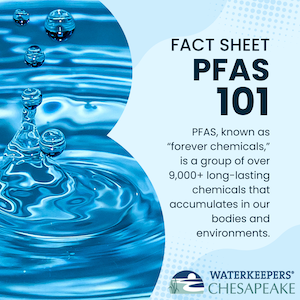 What is PFAS? If you have been asking that question, check out our simple fact sheets (in English & Spanish) on the “forever chemicals.” PFAS is a group of long-lasting chemicals that accumulates in our bodies and environments. Manufacturing of these chemicals began decades ago and they cause severe health problems, including cancer. This is why our Waterkeepers are working hard to stop them at their sources and remove them from our waterways. You can also check out the PFAS in the Chesapeake Bay Region story map. The story map gives an overview of the science, public health threats, climate change impacts, and environmental justices issues, and includes an in-depth look at Baltimore and Pennsylvania.