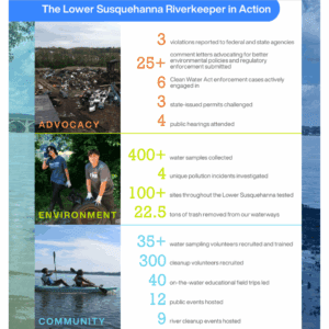 los Lower Susquehanna Riverkeeper lanzó el Programa Semanal de Monitoreo de Bacterias de Water Watchdog para el Cuenca hidrográfica del bajo río Susquehanna En 2023. El objetivo de este programa es informar a la gente cuándo los accesos públicos populares a ríos y arroyos son seguros para la recreación. El programa se lleva a cabo todos los jueves, desde el Día de los Caídos hasta el Día del Trabajo, en 15 sitios de la cuenca. Los resultados se comparten todos los viernes. en la página de inicio, a través de las redes sociales y en la aplicación SwimGuide.