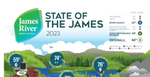 Asociación del río James, hogar de la James Riverkeeper, monitores 29 sitios, con datos disponibles públicamente en Reloj del río James, incluyendo un mapa del estado del río que informa al público sobre los niveles de bacterias y otras condiciones del río durante el verano. El más reciente Estado de James El informe utiliza datos de 2023 para demostrar los esfuerzos continuos para recuperar la salud del río James. Se publica cada dos años.