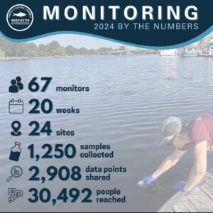 los Anacostia Riverkeeper Monitoreo de la calidad del agua Programa Proporciona datos sobre 24 sitios en el Distrito de Columbia, el condado de Montgomery y el condado de Prince George. Creado en 2019 y basado en la ciencia comunitaria, el programa recluta a decenas de voluntarios capacitados para tomar muestras de agua. Durante 20 semanas, de mayo a septiembre, todos los miércoles por la mañana se toman muestras y se miden los valores de la calidad del agua. El estado actual del río se puede consultar en este mapa. ARK publicó recientemente sus Informes de Monitoreo de la Calidad del Agua de Ciencia Ciudadana de 2024 para Distrito de Columbia y MarylandEstos informes estudian seis parámetros: bacterias, oxígeno disuelto, turbidez, pH, temperatura del agua y temperatura del aire.