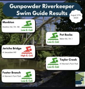Gunpowder Riverkeeper proporcionarMonitoreo de es en los condados de Baltimore y Harford a lo largo de la Cuencas hidrográficas de Gunpoder y Bush RiverEn asociación con Community Environmental Laboratories, un laboratorio de análisis de agua certificado por EPA ubicado en el condado de Harford, Gunpowder Riverkeeper realiza muestreos en varios puntos de acceso a lo largo del río para sus respectivos niveles de E. coli. Desde 2019, los resultados se han publicado en Guía de natación para informar al público sobre dónde pueden recrearse de manera segura, así como indicar la posible contaminación por aguas pluviales o de fuentes puntuales.