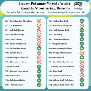 Red Potomac Riverkeeper, hogar de la Alto Potomac, Potomac y Shenandoah RiverkeepersMonitorea 29 sitios en DC, Virginia y Maryland a través de su programa de monitoreo de ciencia comunitaria con más de 100 voluntarios capacitados. El programa está activo desde 2019. Un mapa público está disponible en su página de inicio de monitoreo., y comparten resultados actuales de la calidad del agua e información sobre la seguridad de los sitios de acceso público en SwimGuide y Facebook todos los viernes entre mayo y finales de septiembre. Informe sobre el Potomac apto para nadar de 2024 Descubrieron que los sitios de monitoreo cumplían con los estándares de calidad del agua basados en la salud pública el 71 por ciento de las veces.