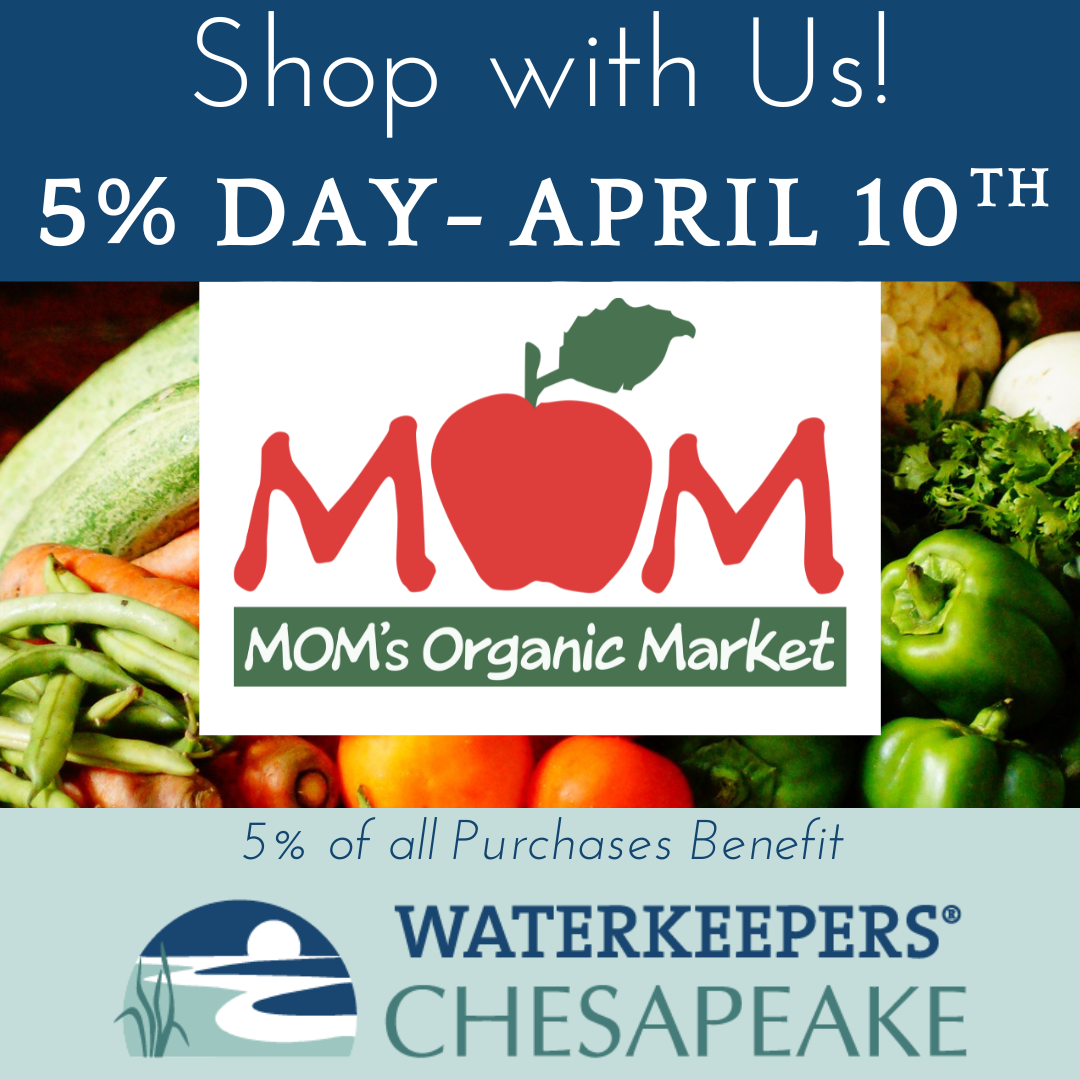 Mark your calendar to visit your local MOM’s Organic Market on Wednesday, April 10! On this 5% Day, your shopping dollars at 12 stores in Maryland, DC and Virginia will benefit Waterkeepers Chesapeake, Gunpowder Riverkeeper, Patuxent Riverkeeper, Anacostia Riverkeeper, Baltimore Harbor Waterkeeper and Potomac Riverkeeper Network.