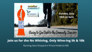 The race starts and ends at Running Hare Vineyard (150 Adelina Rd, Prince Frederick, MD 20678). Parking is on-site. Come out and enjoy these scenic 5k/10k courses at this gorgeous vineyard. Walkers and strollers are welcome to attend this event. A virtual run option is available for those who cannot make it on race day. Participants of the virtual run will receive a medal.